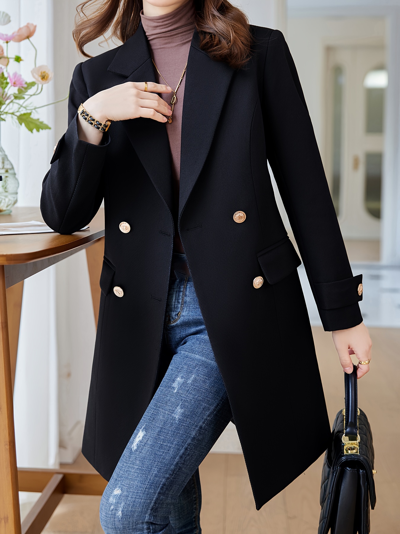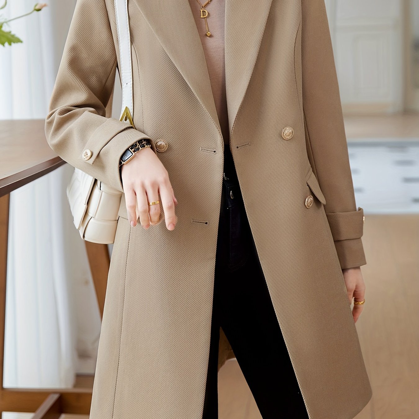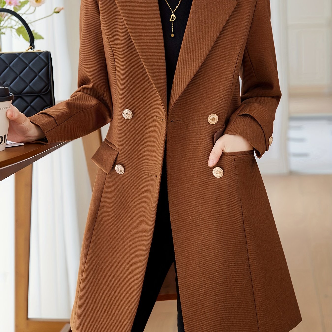 Solid Double Breasted Lapel Overcoat, Elegant Long Sleeve Mid Length Coat For Fall & Winter, Women’s Clothing